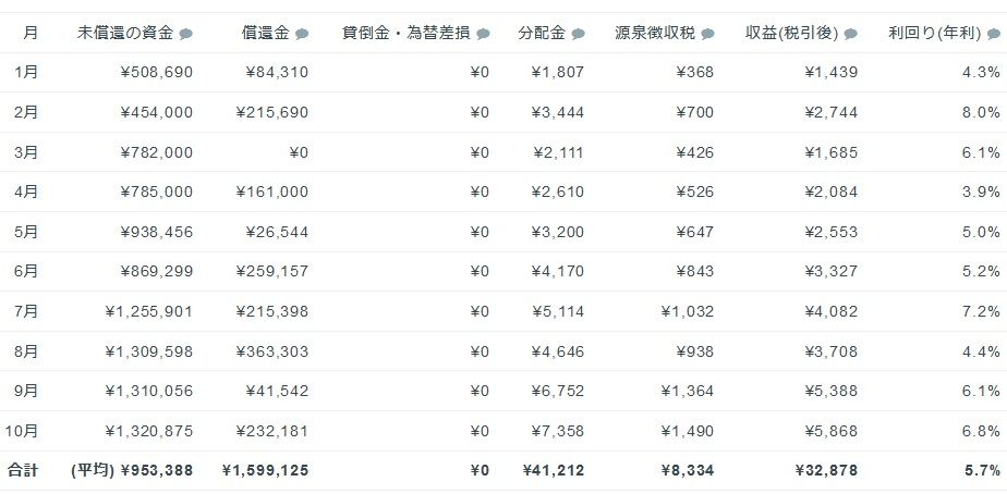 画像が小さくて申し訳ないのですが、10月はおよそ132万円を運用し、収益は7,358円。