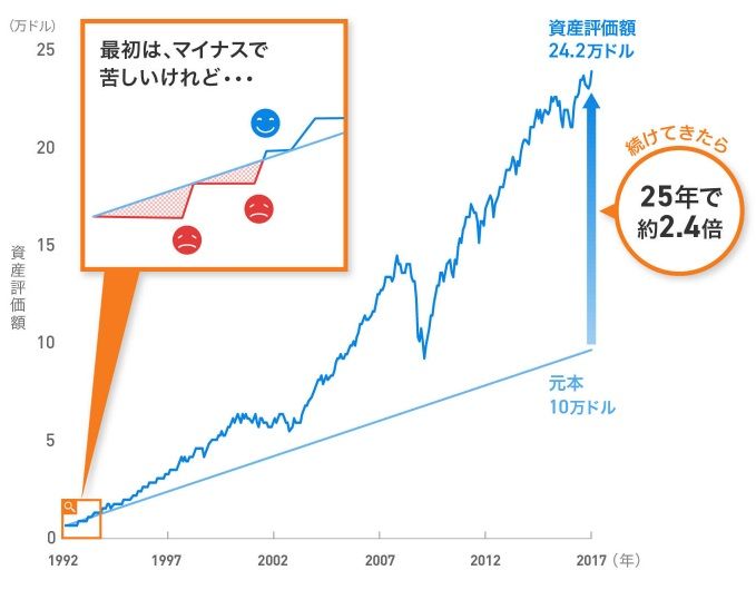 株価が下落しているときに「買い」をすることは損益分岐点を下げていくことになるわけなので、長期的に見れば得なわけです。