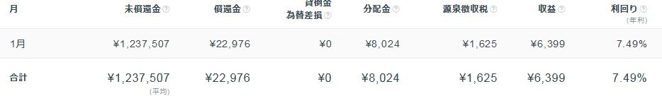 1月は123万円を運用。分配金が8,024円で、そこから源泉徴収税を除くと6,399円の収入がありました。昨月までは130万円ほど運用していましたが、数万円は次回の投資に向けて運用準備中のため、待機中の資金という形になっています。
