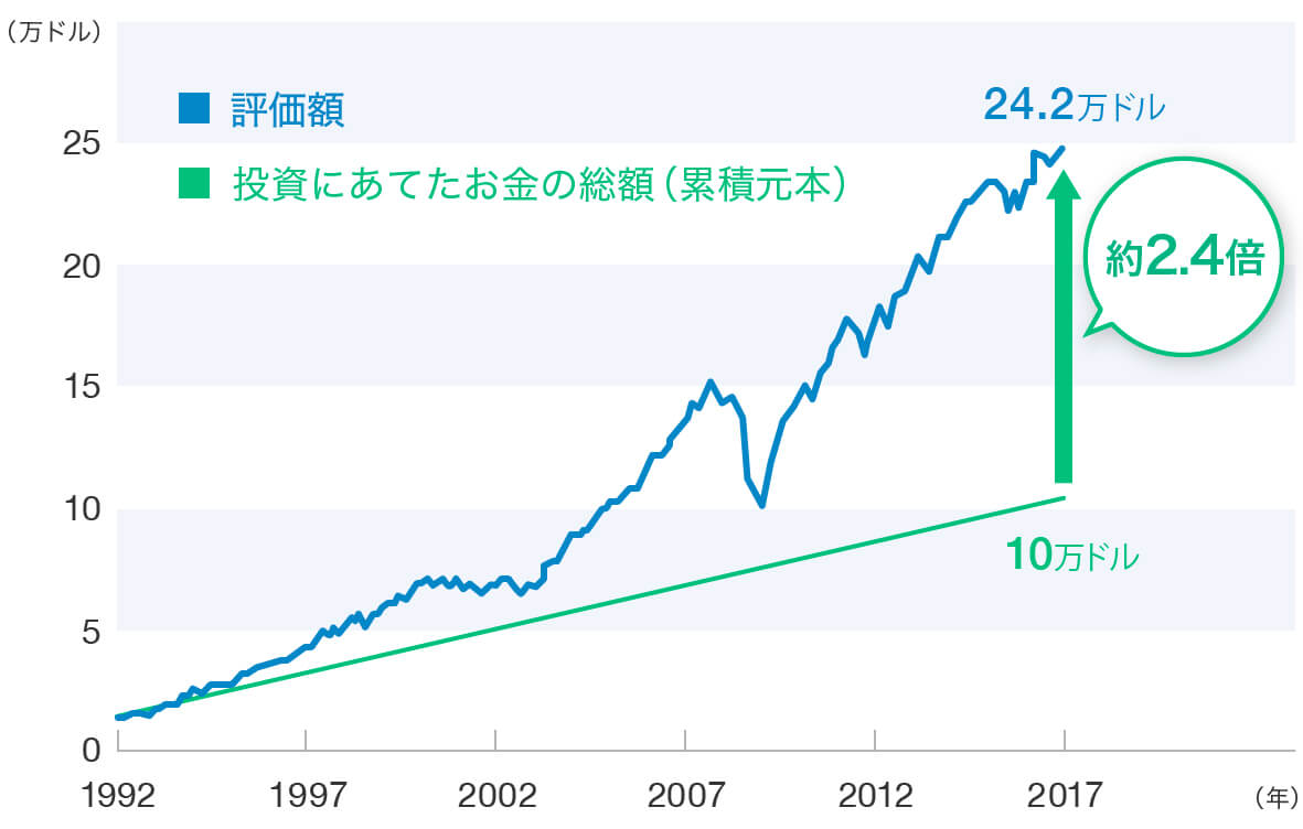過去25年の間には、アジア通貨危機やルーブル危機、ドットコムバブル、リーマンショック、ギリシャ通貨危機、チャイナショックなど、金融危機を何度も経験しています。「100年に一度の危機」と言われたリーマン・ショックのとき、資産は大きく目減りしていますが、時間をかけてそのマイナスを取り返し、むしろ成長しています。