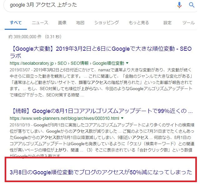 検索キーワードを少し変えて「google 3月 アクセス 上がった」では?